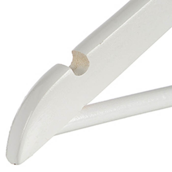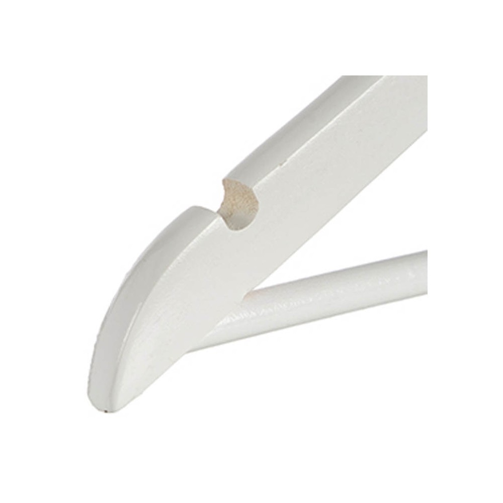 3 Perchas de ropa realizadas en madera blanca con hendiduras para colocar prendas con tirantes y barra para pantalones.