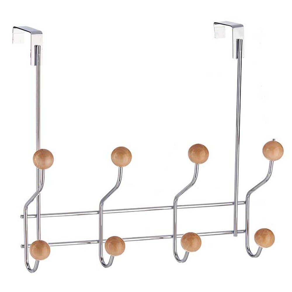 Percha de puerta con 8 ganchos metálicos con bola de madera, ideada para colgar ropa.