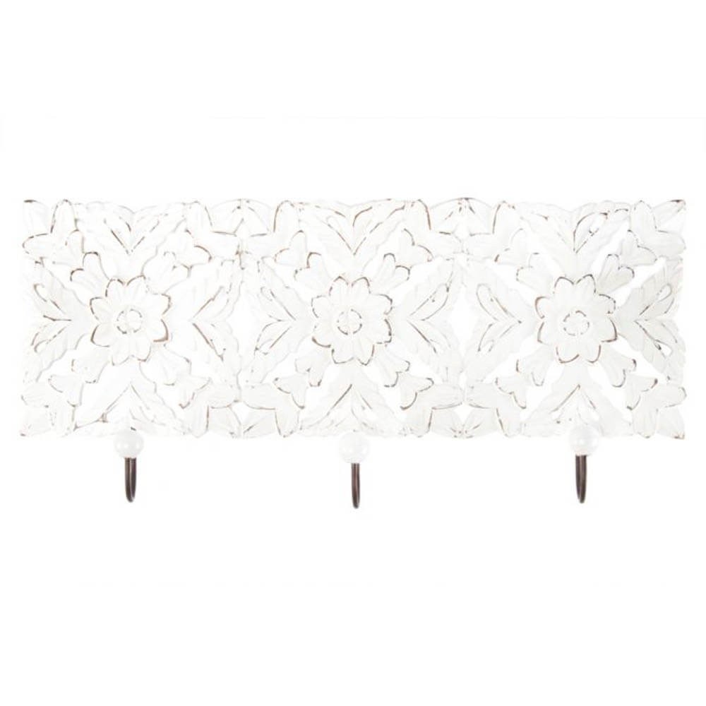 Perchero de pared fabricado en madera MDF con un original tallado floral en color blanco efecto envejecido, cuenta con 3 colgadores de hierro con bolas de cerámica para colgar prendas de abrigo.