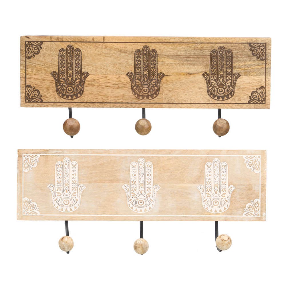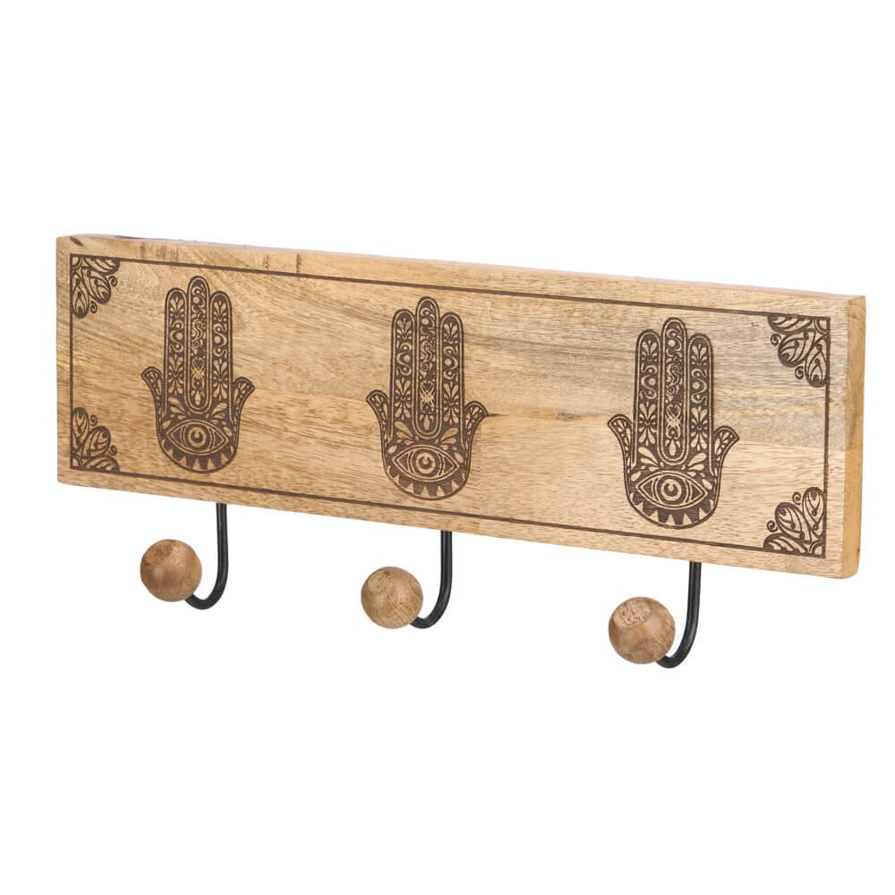 Fabricado en madera de mango, este perchero garantiza durabilidad y resistencia. La madera de mango es conocida por su belleza natural y su capacidad para resistir el paso del tiempo, lo que asegura que este perchero será una adición duradera y atractiva a tu hogar. El diseño Hamsa tallado es un detalle estético impresionante, un símbolo tradicional de protección y buena suerte, aportando un significado profundo a tu decoración.