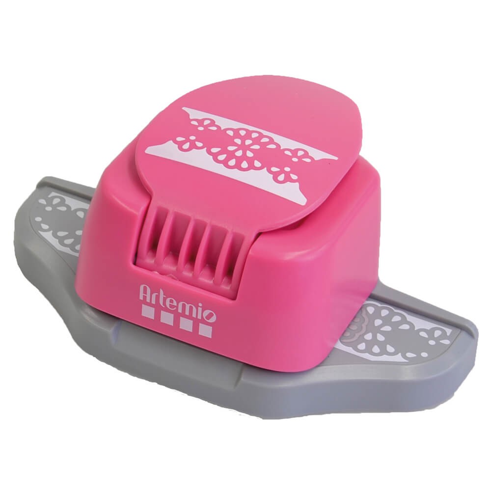 Troqueladora de borde de la marca Artemio en forma de blonda con margaritas. Posee cubierta de seguridad para uso infantil.