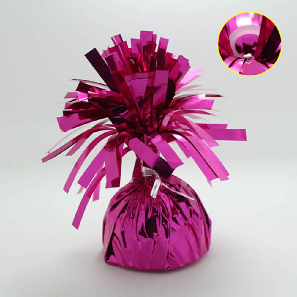 El peso para globos fucsia tiene un diseño divertido de flecos metalizados, ideal para dar un acabado perfecto en los ramos de globos de cumpleaños, bautizo, despedida de solteras, etc.