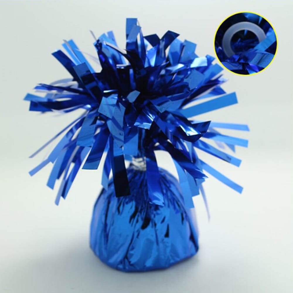 El peso para globos azul tiene un diseño divertido de flecos metalizados, ideal para dar un acabado perfecto en los ramos de globos de cumpleaños, bautizo, comunión, baby shower, etc.