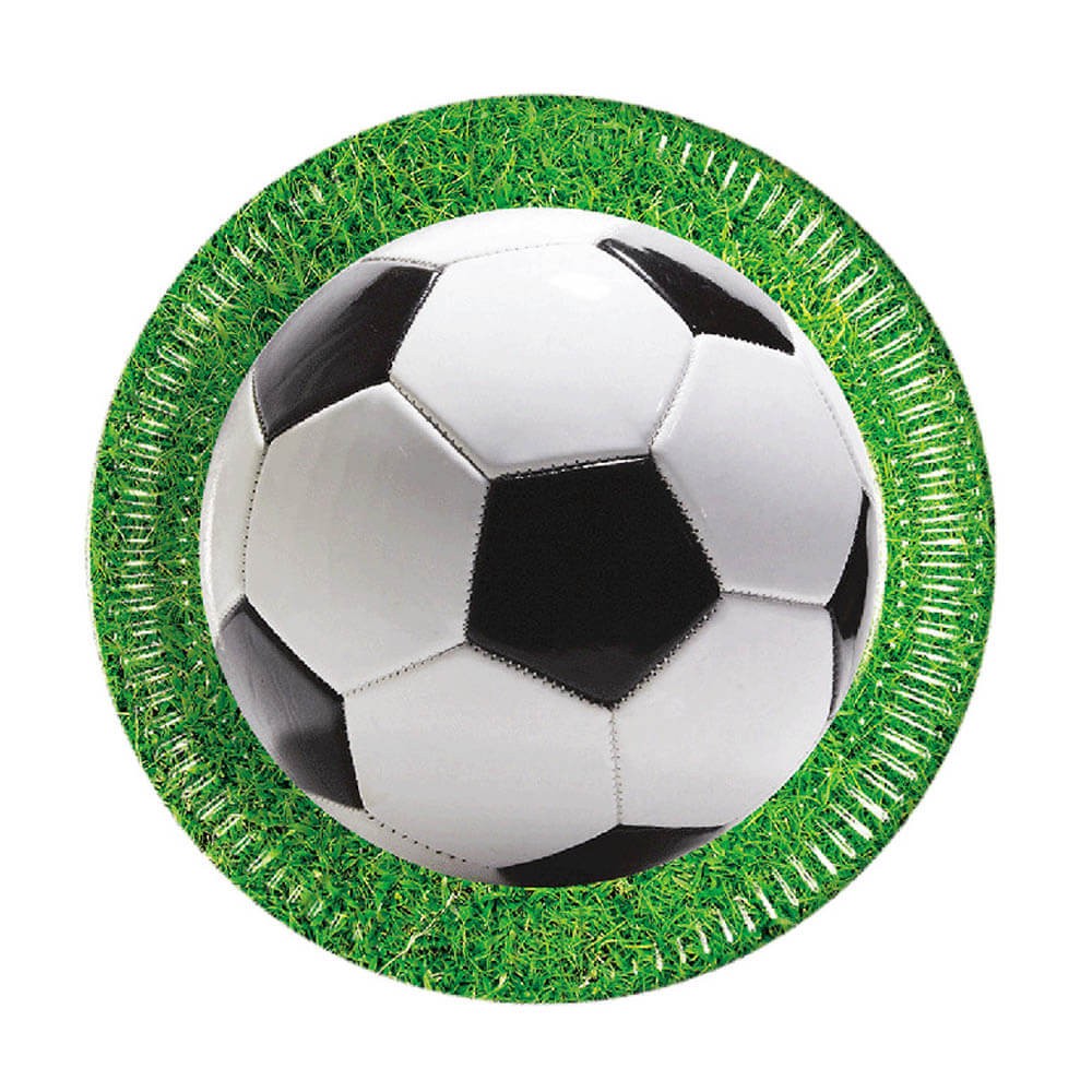 8 Platos desechables para fiesta diseño Futbol, decorados co un balón de futbol en la superficie y el borde con una impresión de césped.