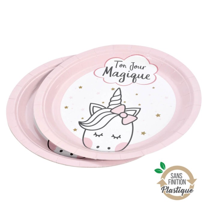 6 Platos desechables para fiesta diseño Unicornio, fabricados en cartón resistente con una bonita impresión de un unicornio con lazo sobre fondo blanco con estrellas y borde rose. Aptos para entrar en contacto con alimentos.