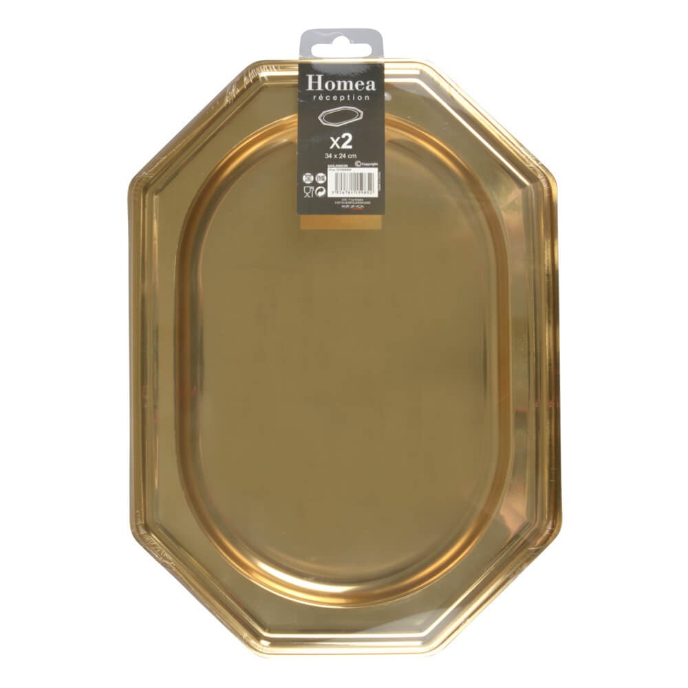 Juego de 2 bandejas reutilizables fabricadas en plástico PET de color oro con forma octogonal, perfectas para presentar todo tipo de alimentos en la mesa.