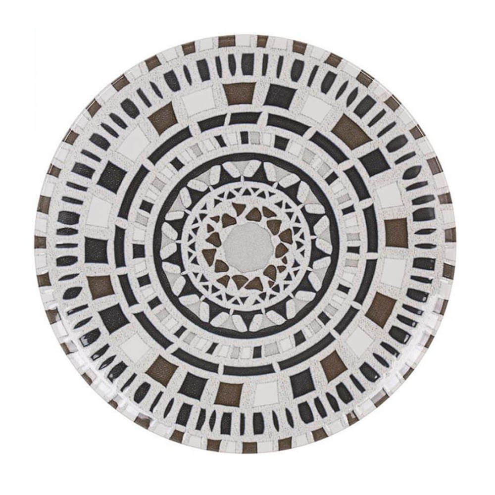 Plato llano de 26 cm de diámetro modelo Barroco realizado en porcelana decorada. Un plato decorado con un maravilloso diseño de aspecto artesanal en tonos marrones, perfecto para dar un toque personal a la mesa.
