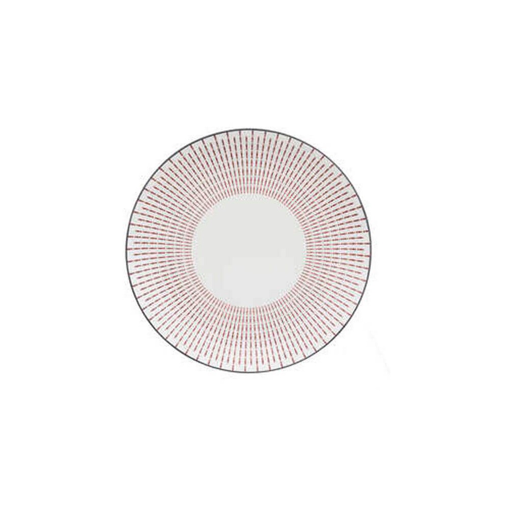 Plato llano de 26,7 cm de diámetro realizado en porcelana blanca con la superficie decorada con un patrón de líneas rojas con el filo negro, diseño de estilo oriental, ideal para resaltar los alimentos que contenga.