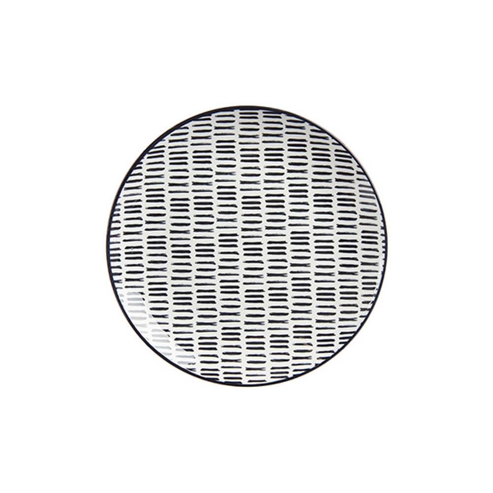 Plato llano de porcelana blanca con la superficie decorada con líneas negras y filo negro.