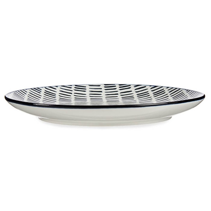 Plato llano de 24 cm de diámetro realizado en porcelana blanca con la superficie pintada con líneas negras desiguales y el filo negro, diseño de inspiración oriental, ideal para resaltar los alimentos que contenga.