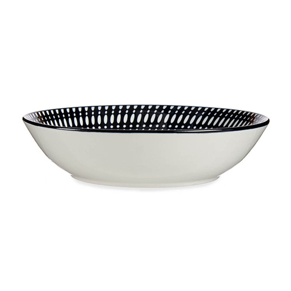 Plato hondo de 20 cm de diámetro realizado en porcelana con la superficie pintada de negro con un dibujo de inspiración étnica de líneas blancas, ideal para resaltar los alimentos que contenga.