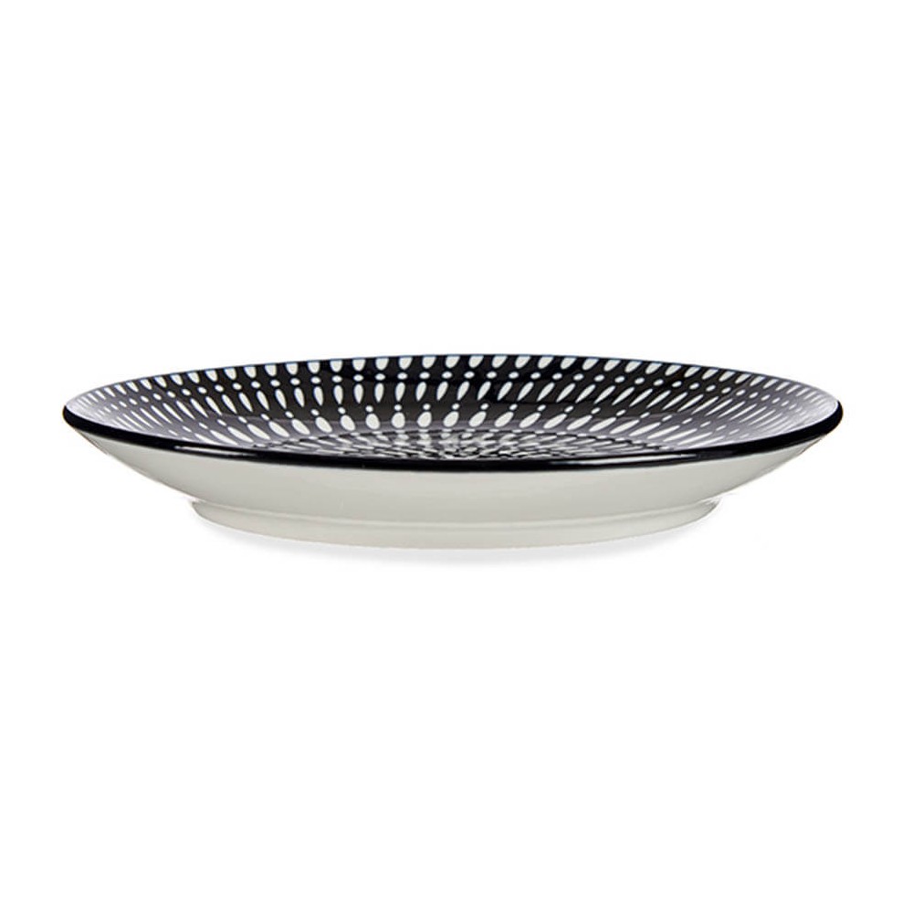 Plato de postre de 19,5 cm de diámetro realizado en porcelana con la superficie pintada de negro con líneas blancas formando un dibujo de estilo étnico, ideal para resaltar los alimentos que contenga.