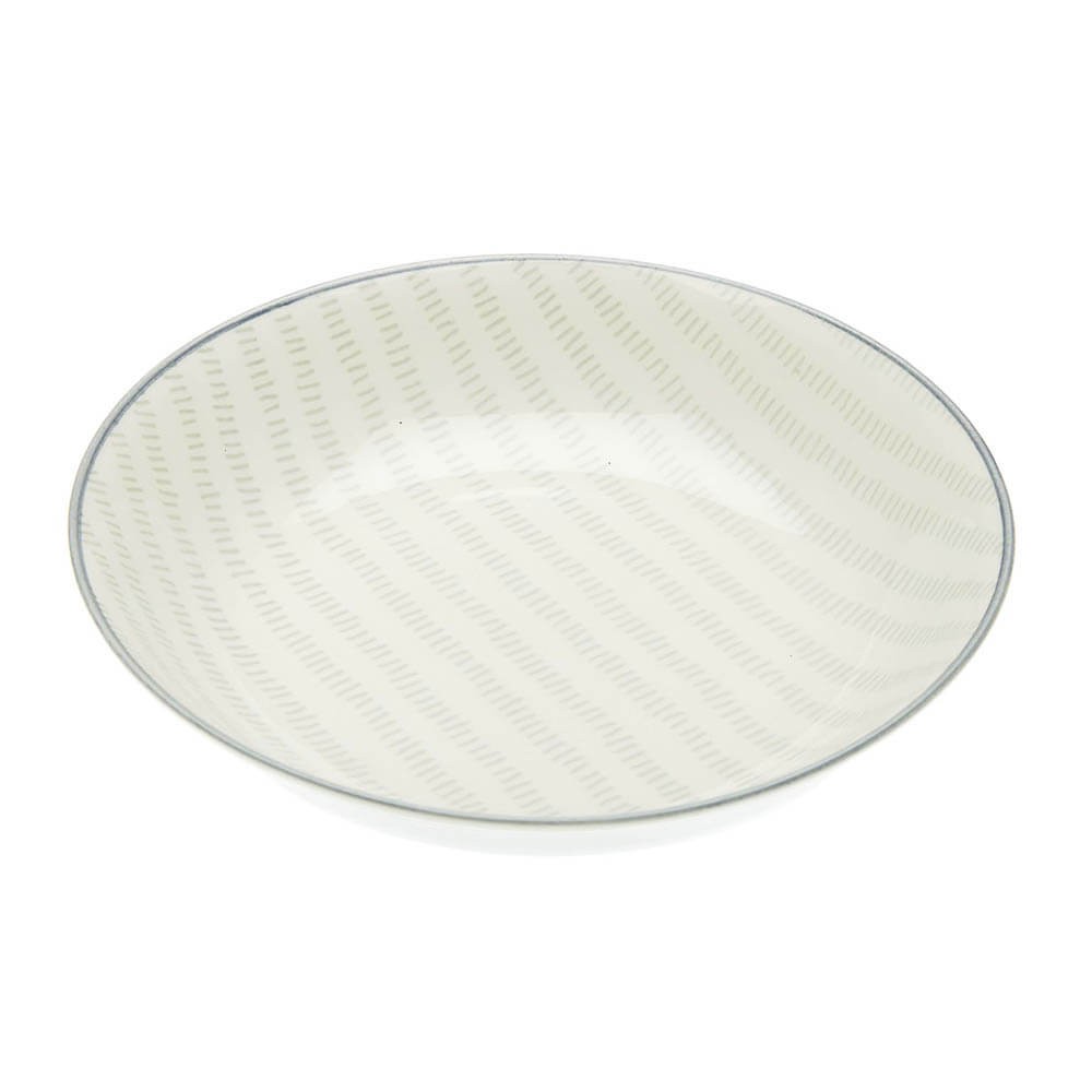 El plato hondo tiene 20 cm de diámetro y esta realizado en porcelana duradera y resistente con un bonito diseño en tendencia de inspiración oriental, lleva la superficie decorada con líneas sutiles y el filo gris, un tono que siempre es una apuesta segura.