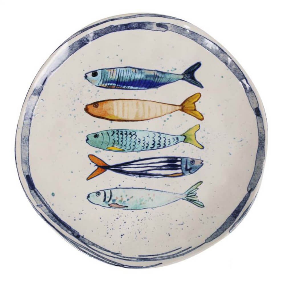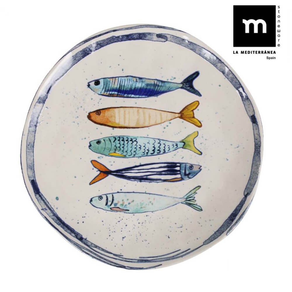 Plato llano de cerámica decorado con peces. Alegre, resistente y con estilo mediterráneo.