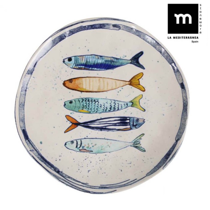 Con unas dimensiones de 26 x 26 x 2 cm, este plato es ideal para el día a día, comidas con invitados o cenas al aire libre. Su decoración con cinco peces aporta un aire marino, alegre y perfecto para quienes buscan una vajilla con aire mediterráneo.