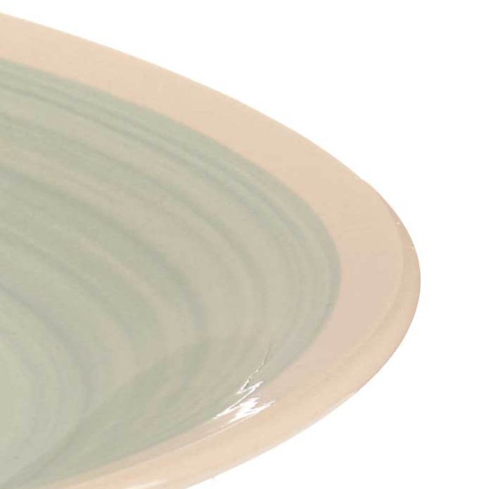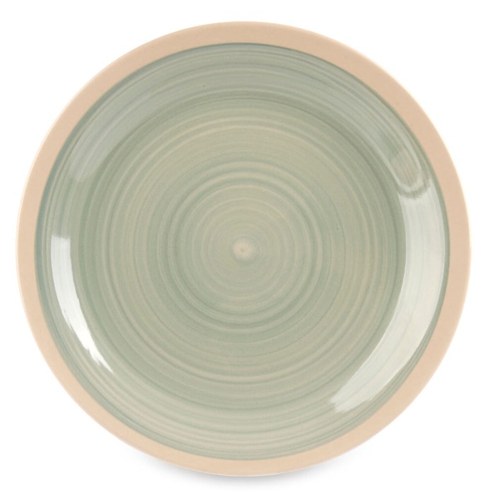 Conjunto de 6 platos llanos de cerámica de 26,5 cm. Superficie pintada en color verde y diseño rústico, perfectos para servir tus platos principales.