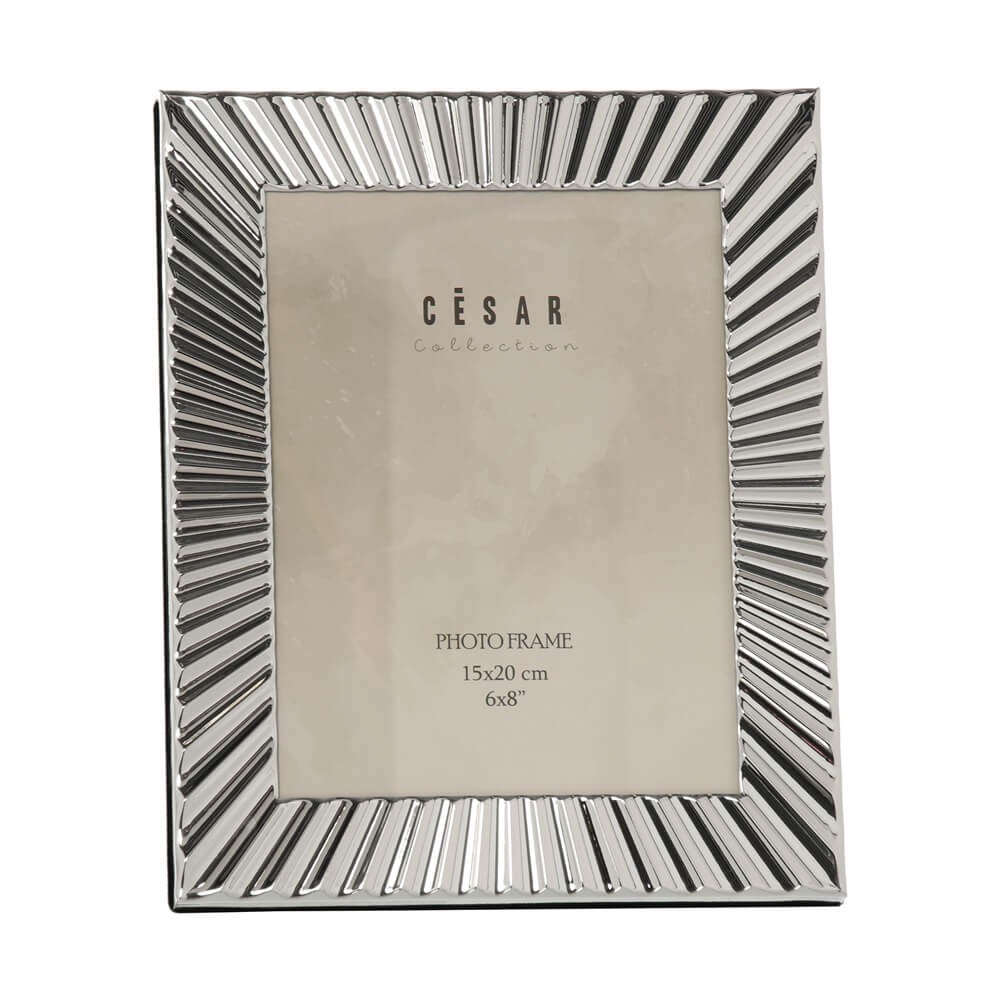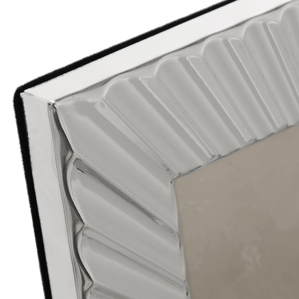 Marco de fotos plateado de diseño clásico y elegante con el marco ancho realizado en metal acabado brillo, diseño original de líneas en forma de rayos con doble altura.