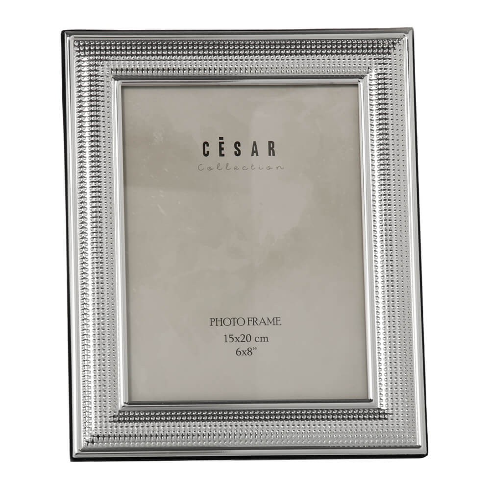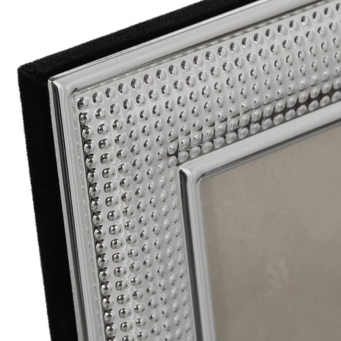 Marco de fotos plateado con un diseño clásico y elegante, lleva el marco ancho realizado en metal acabado brillo con puntos en relieve. Los tonos metalizados aportan elegancia y están en tendencia para la decoración del hogar.