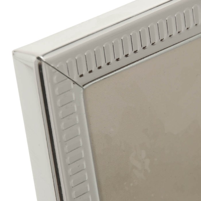 Portafotos plateado de estilo clásico con el marco realizado en metal labrado con un diseño simple y elegante de líneas en relieve, lleva ventana de cristal para proteger las fotografías del polvo. Los tonos metalizados están en tendencia para la decoración del hogar, aportan sofisticación y elegancia.