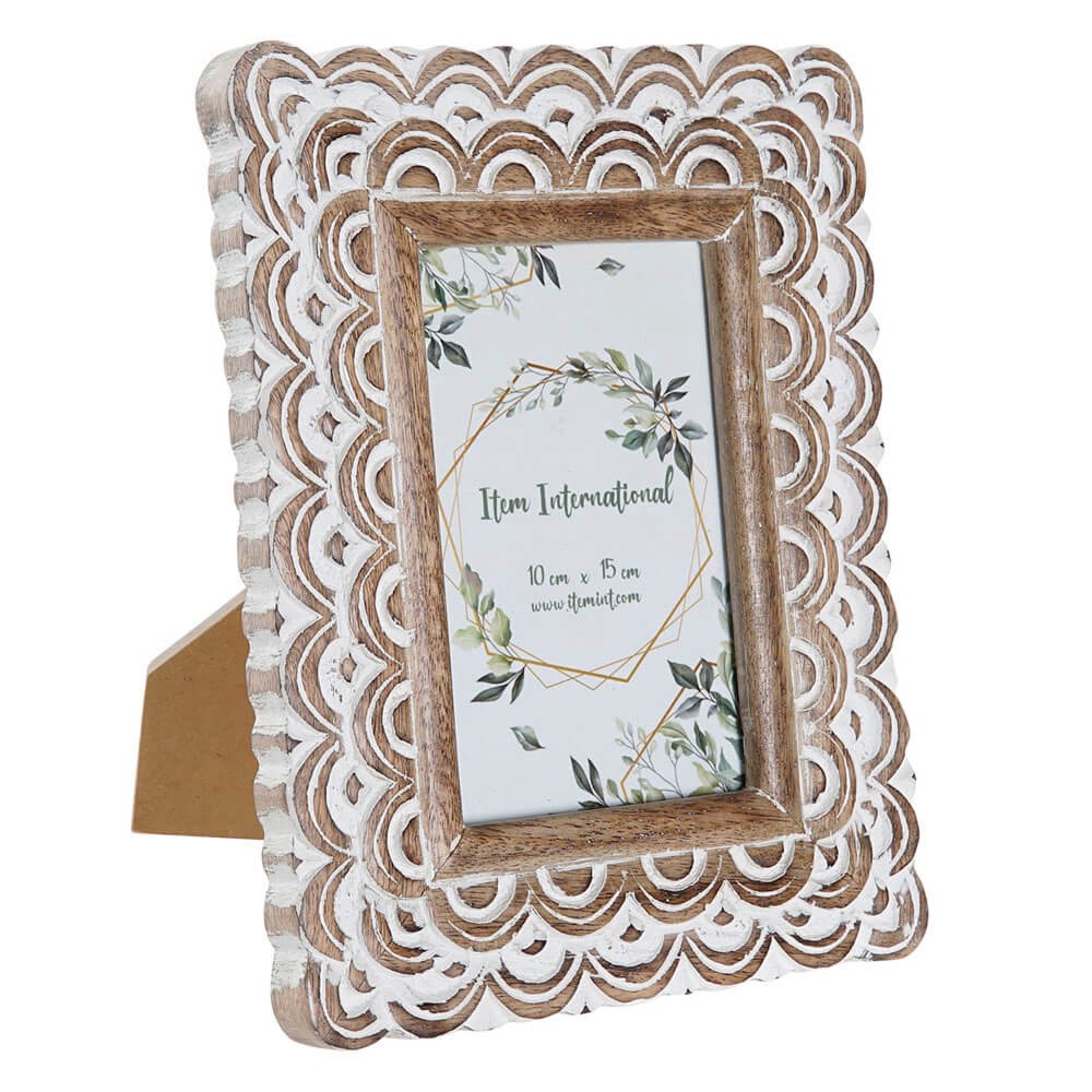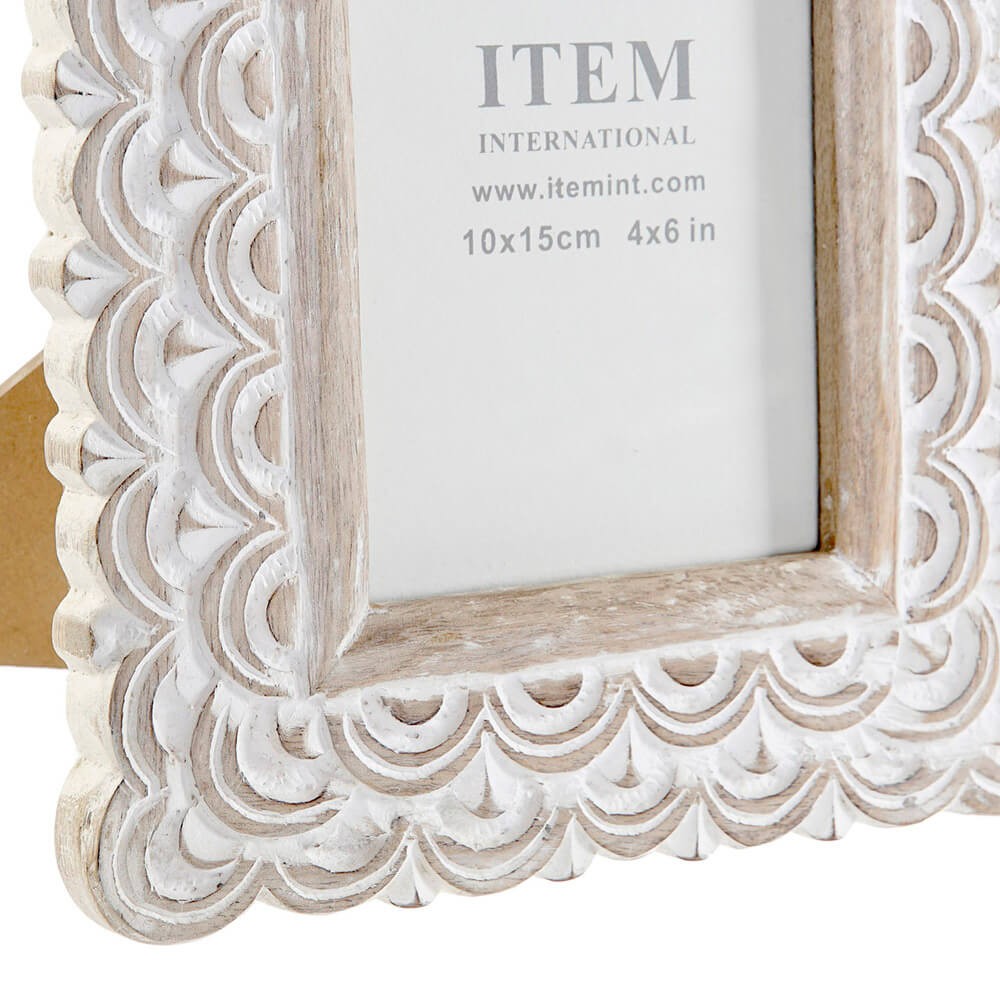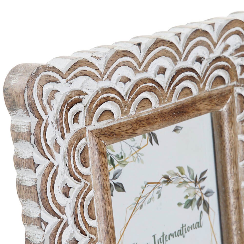 Marco de fotos de estilo oriental fabricado en madera de mango tallada con acabado rozado en blanco, ideal para crear ambientes acogedores. La madera es una material natural que aporta calidez.