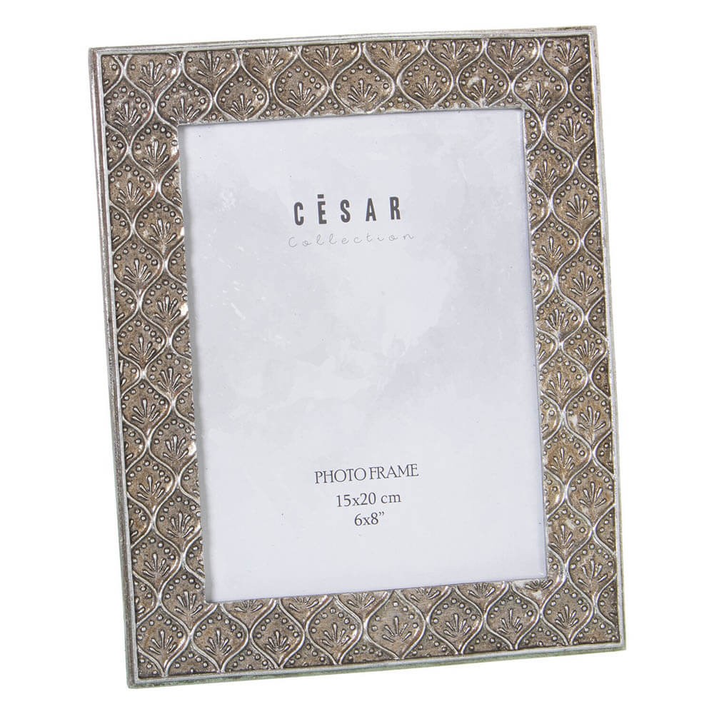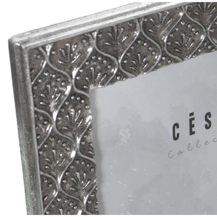 Marco de fotos plateado para fotografía de 15x20 cm, fabricado en resina con formas en relieve.