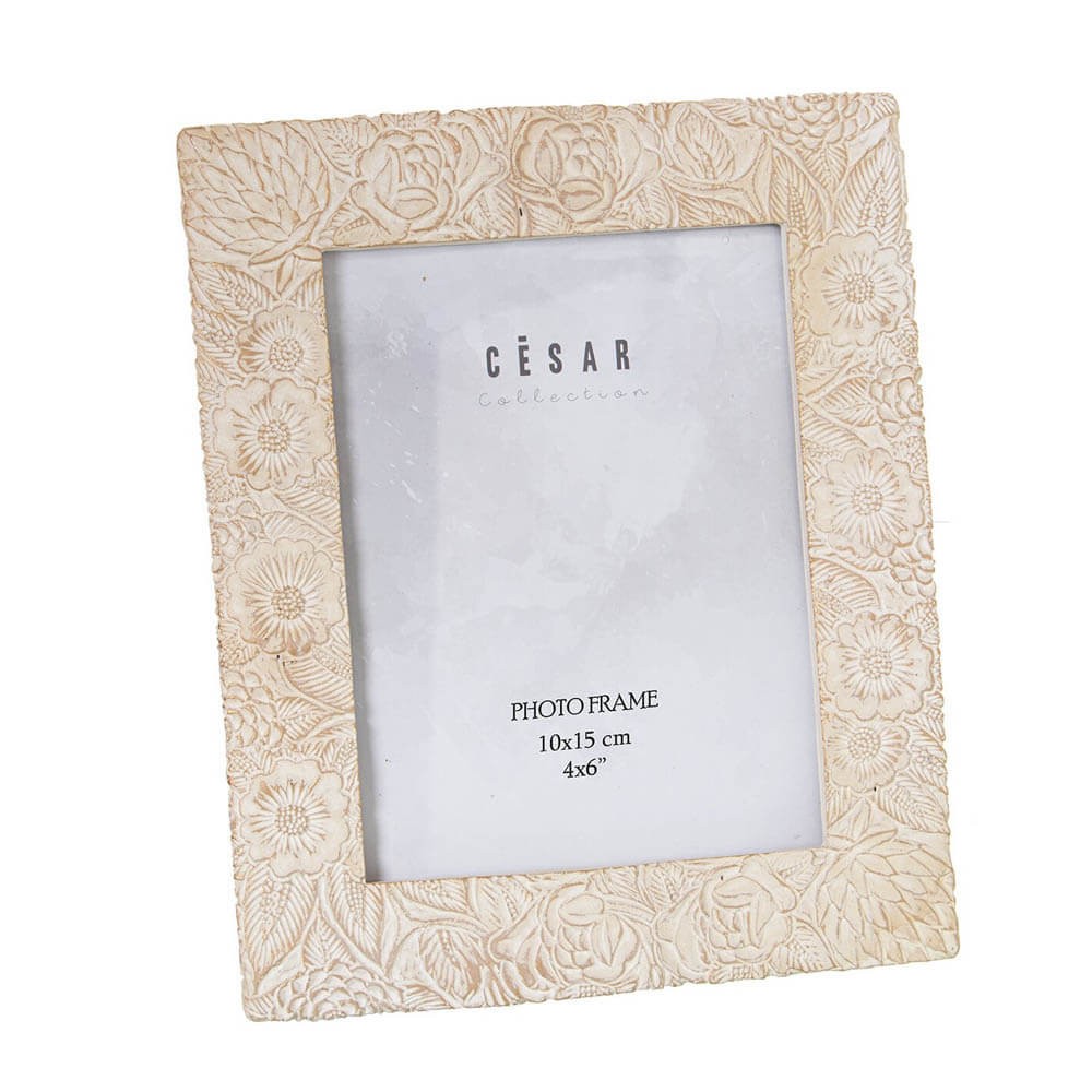 Marco de fotos para fotografía de 10x15 cm, fabricado en resina de color blanco envejecido con flores en relieve.