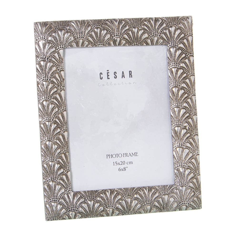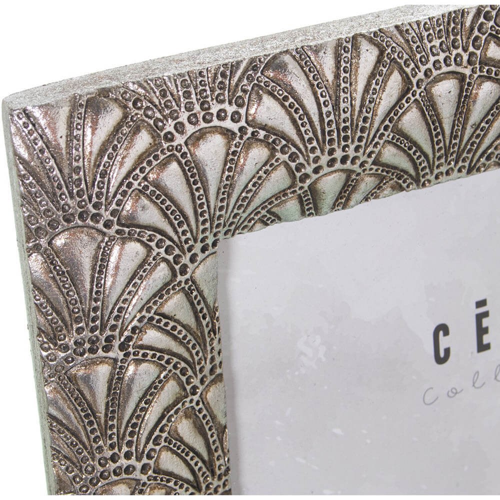 Marco de fotos con un elegante diseño de estilo barroco en color plata envejecida, lleva el marco fabricado en resina con formas geométricas en relieve que recuerdan a los abanicos. Ideal como complemento de decoración para enmarcar una fotografía como se merece de 10x15 cm y personalizar el hogar.
