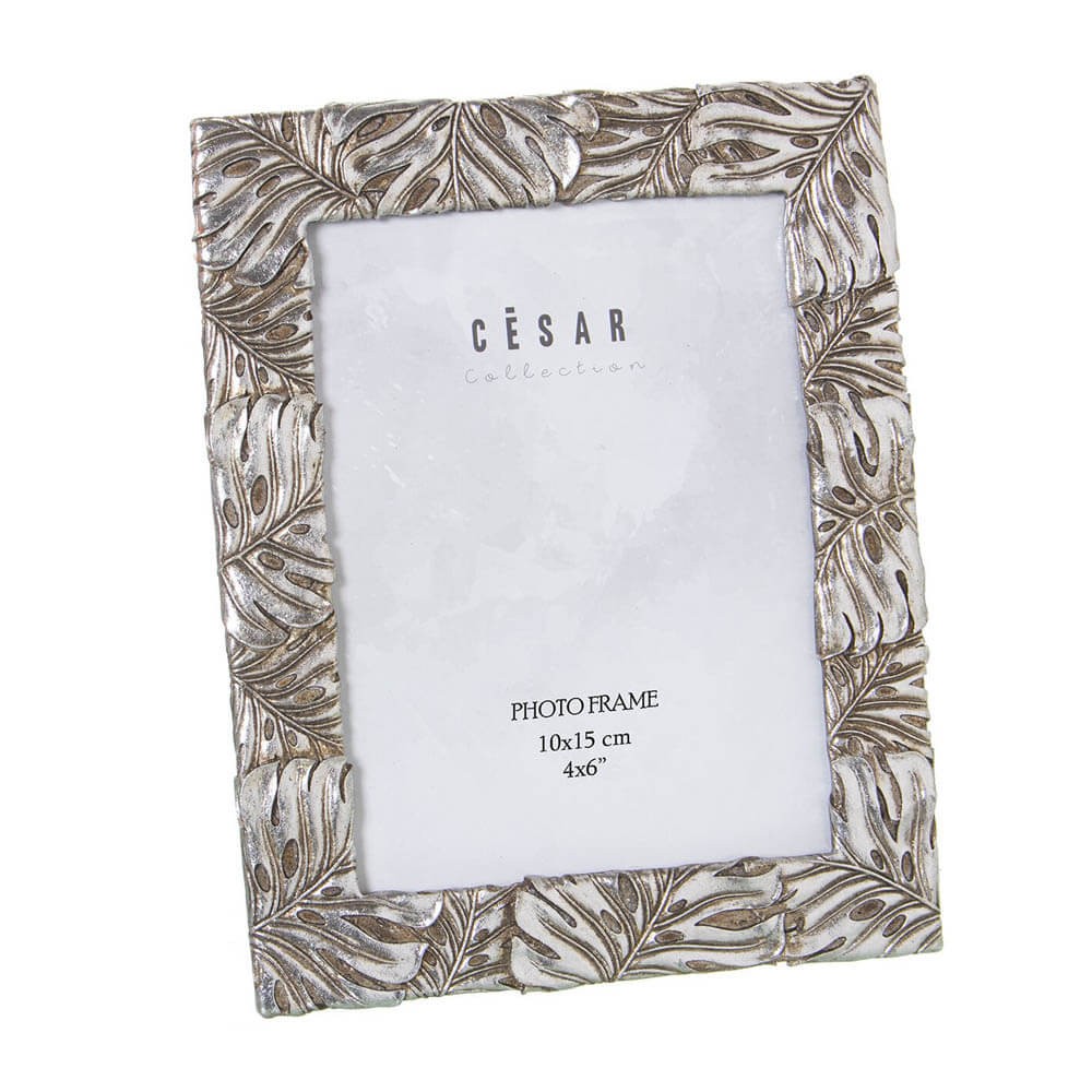 Marco de fotos para fotografía de 10x15 cm fabricado en resina con hojas tropicales en relieve. Diseño en color plata acabado envejecido.