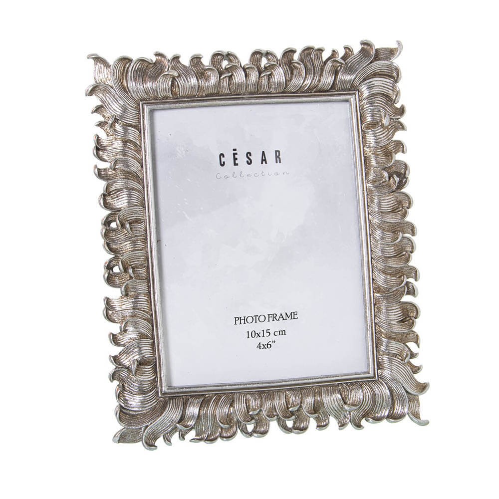 Marco de fotos para fotografía de 10x15 cm, fabricado en resina de color plata envejecida con formas en relieve.