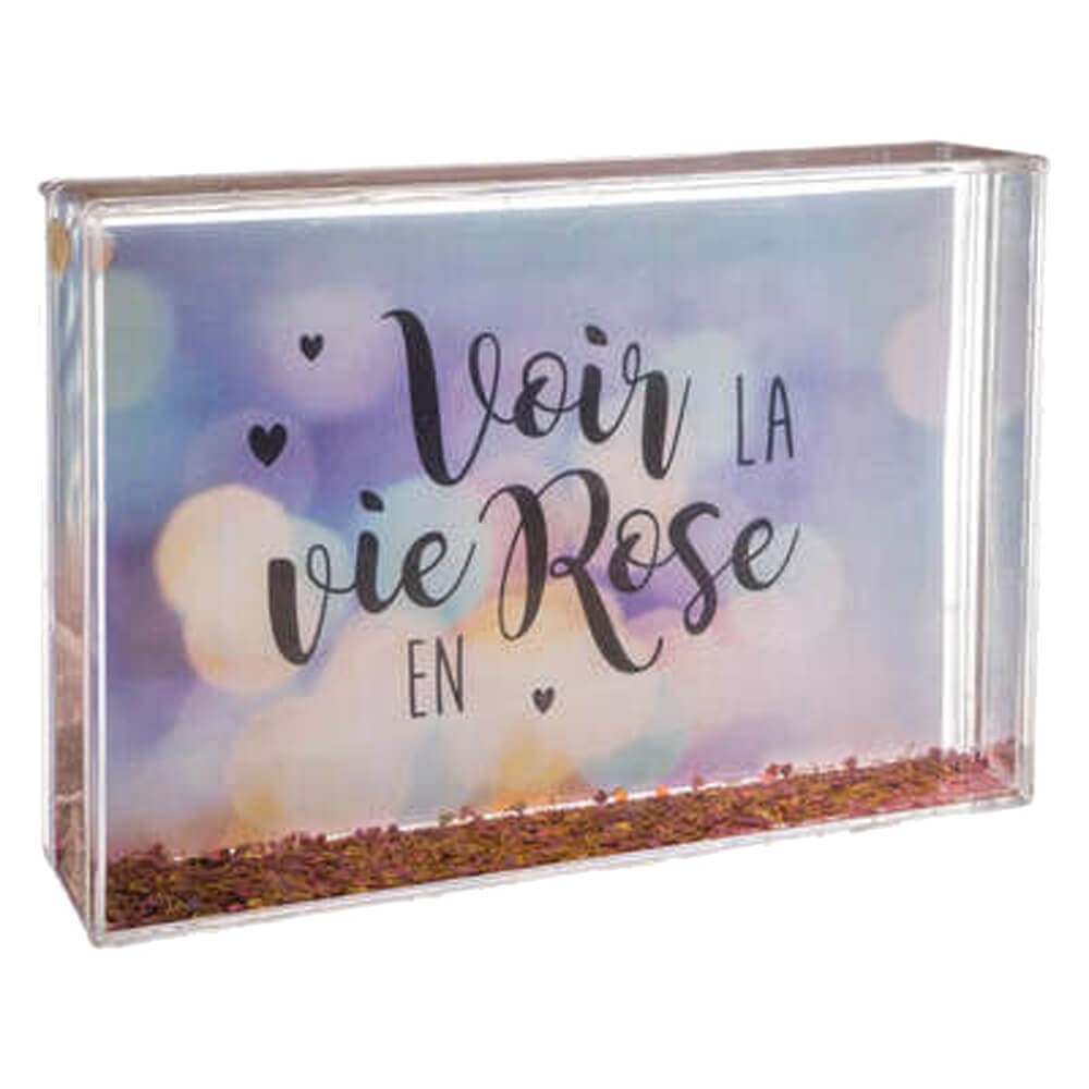 Marco de agua para sobremesa con purpurina y mensaje en Frances, ideal como complemento de decoración para habitaciones infantiles.