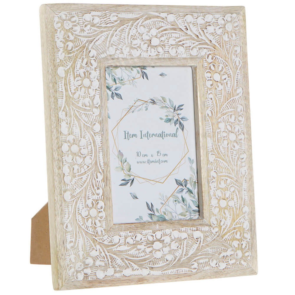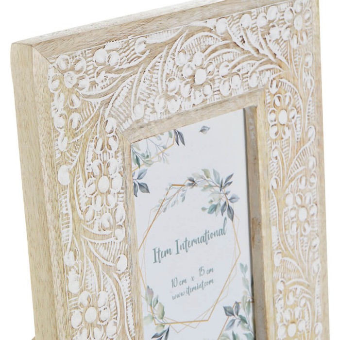 Marco de fotos 10x15 cm en madera de mango labrada con detalles florales.