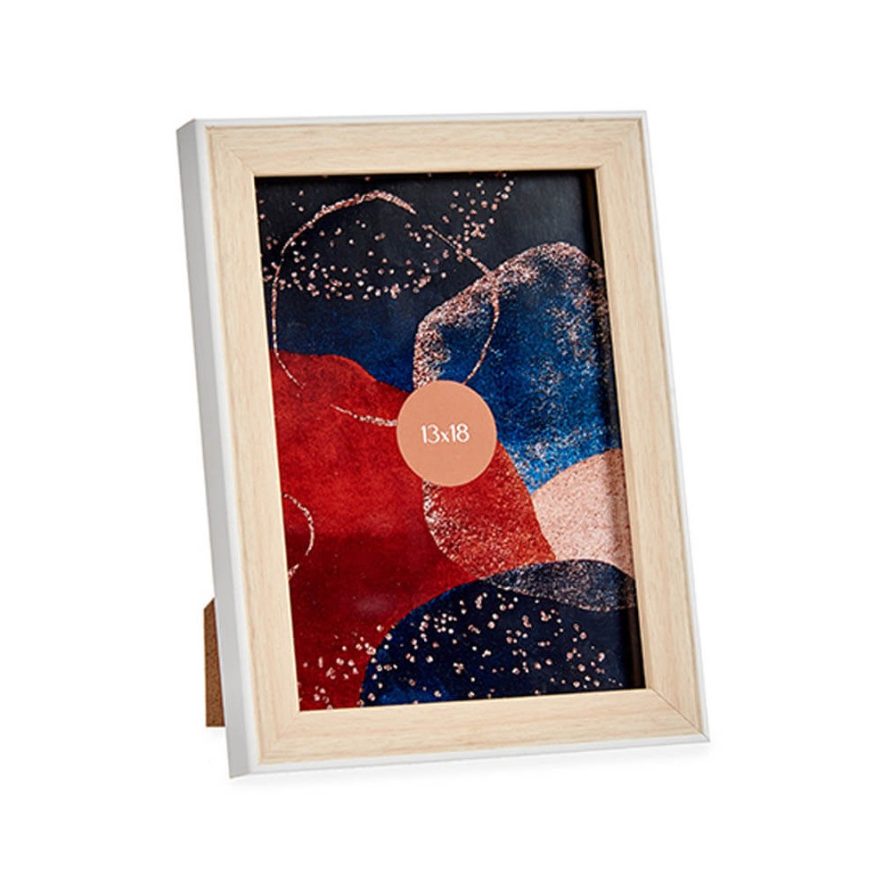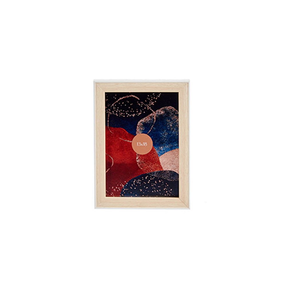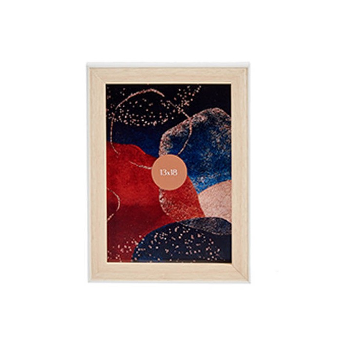 Marco de fotos de líneas rectas para fotografía de 13x18cm cm, fabricado en plástico acabado imitación madera en color natural con el perfil blanco.