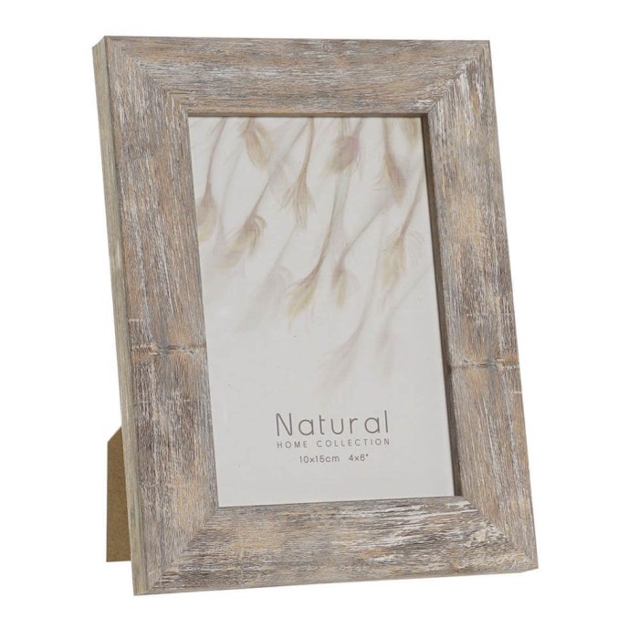 Portafotos rectangular con marco realizado en poliestireno imitación madera acabado envejecido, diseño cálido de lineas rectas en color beige o marrón con frontal de cristal, ideal como complemento de decoración para el hogar.