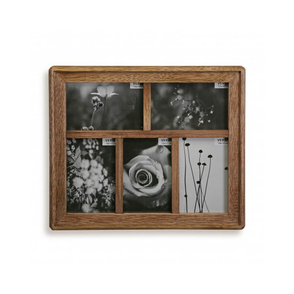 Marco de fotos múltiple para 5 fotografía de 10x15 cm, fabricado en madera de mango en color marrón con el borde ligeramente elevado.