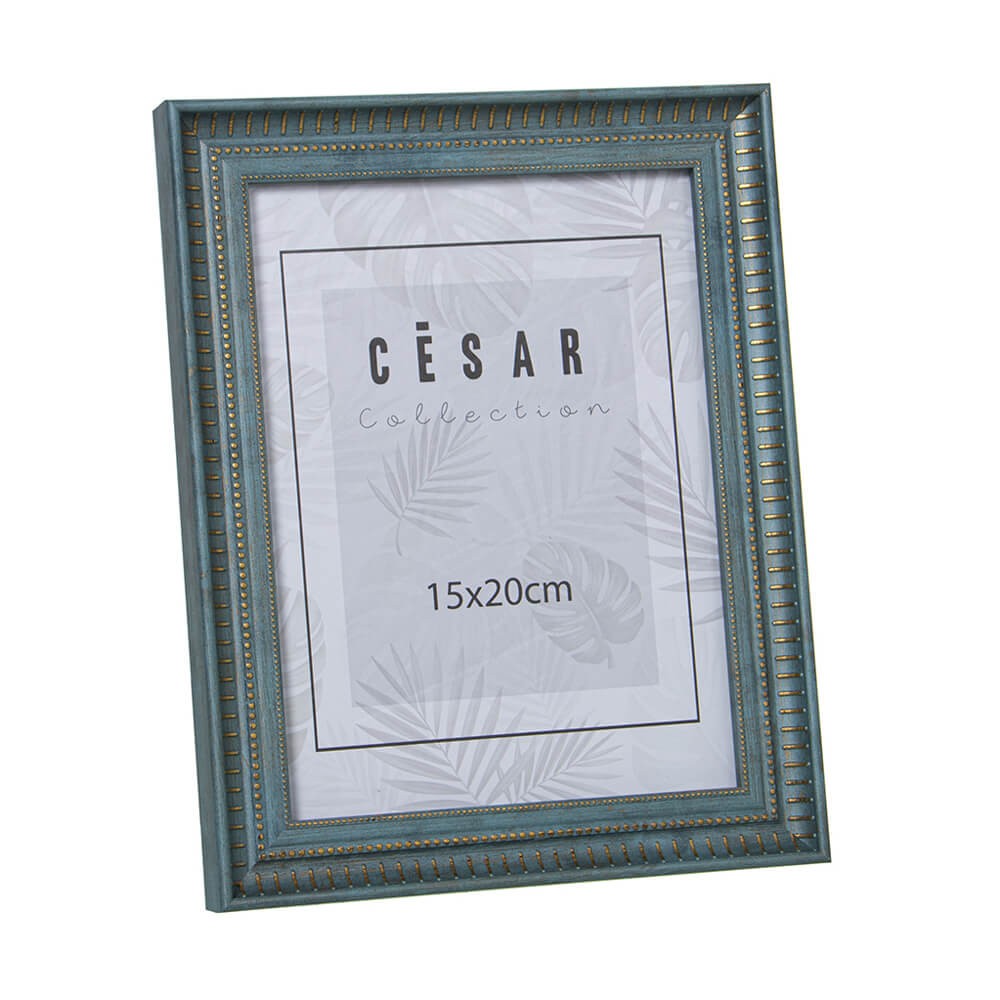 Marco para fotos de 15x20 cm fabricado en plástico poliestireno resistente con trasera de madera DM y protector frontal de cristal, diseño clásico con moldura azul o gris.