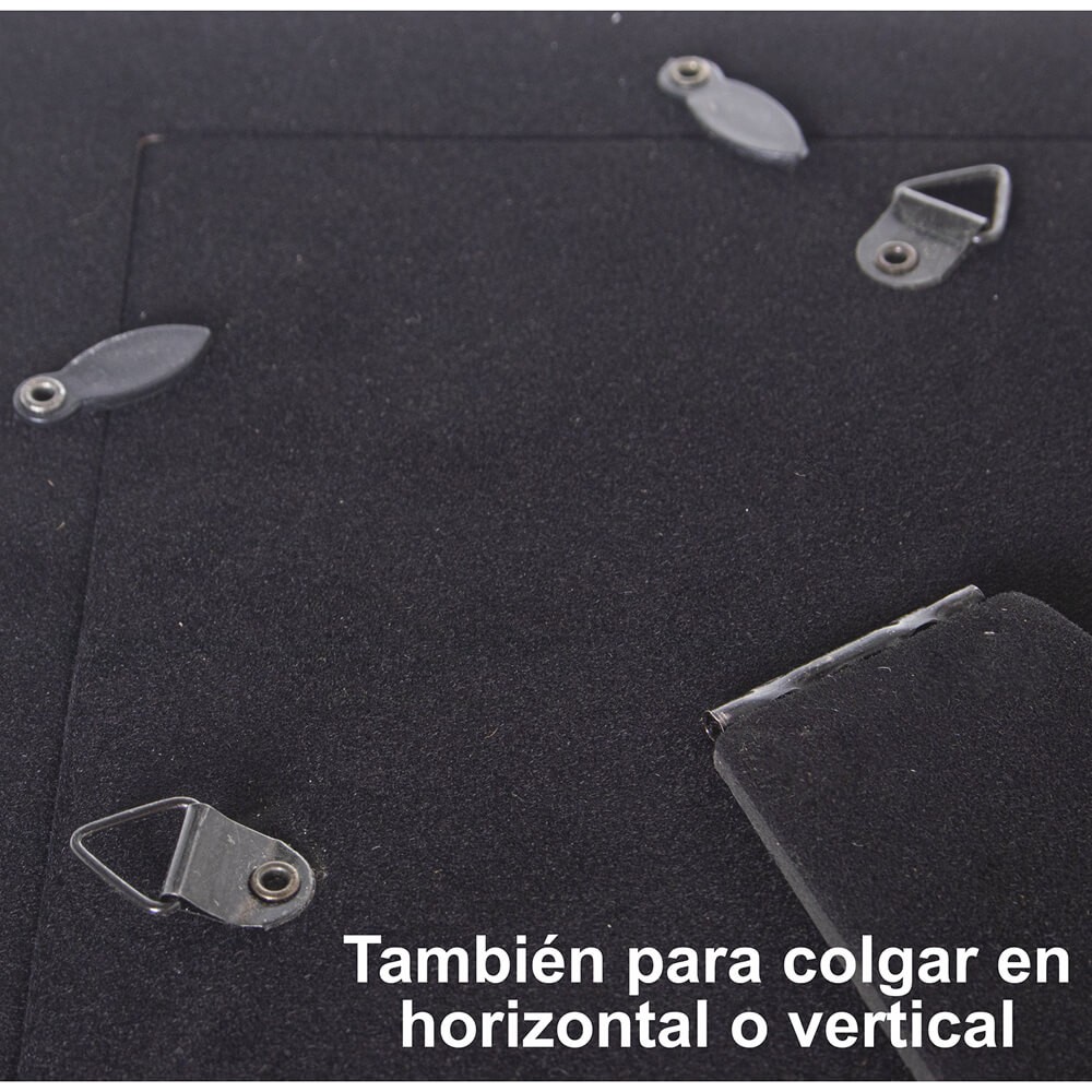 Este portafotos para fotografía de 10x15 cm cuenta con panel robusto de alta calidad en color negro con pie para apoyar y argollas para colgar en la pared.