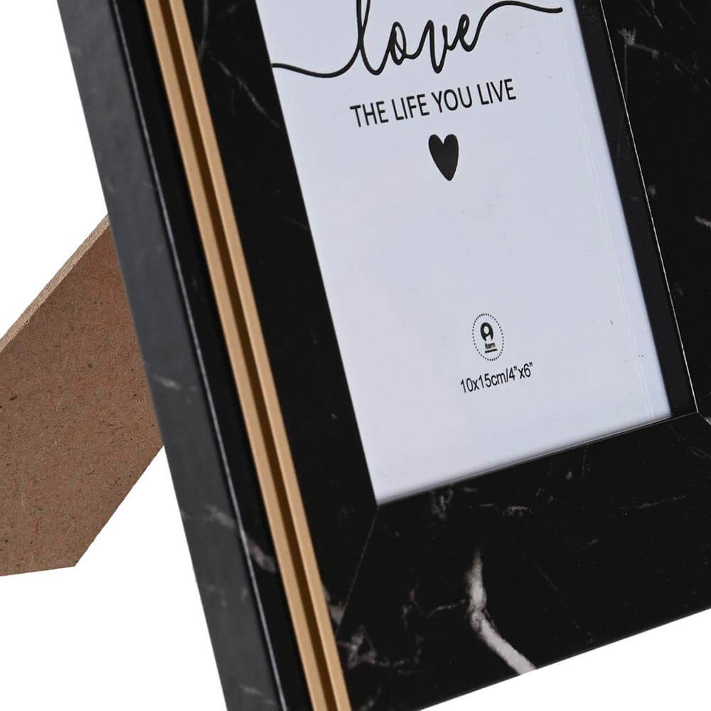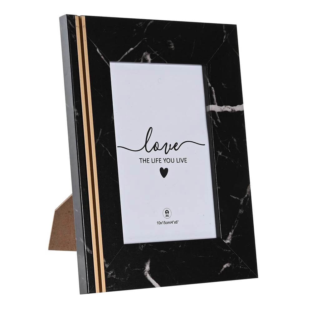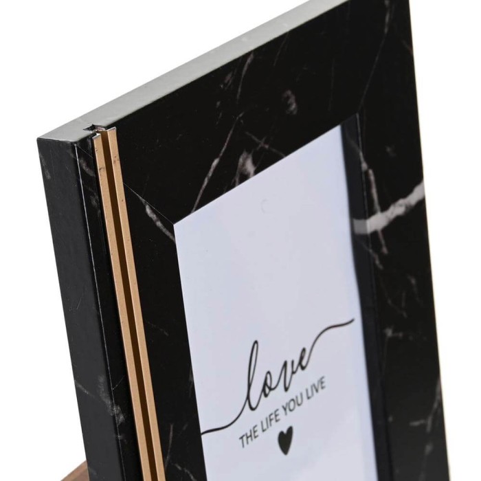 Rodéate de momentos maravillosos en familia y coloca en tu casa preciosas fotografías en este marco de fotos 10x15cm en color negro con impresión acabado mármol y franja metálica dorada con el que además darás un toque elegante a la decoración de tu casa.