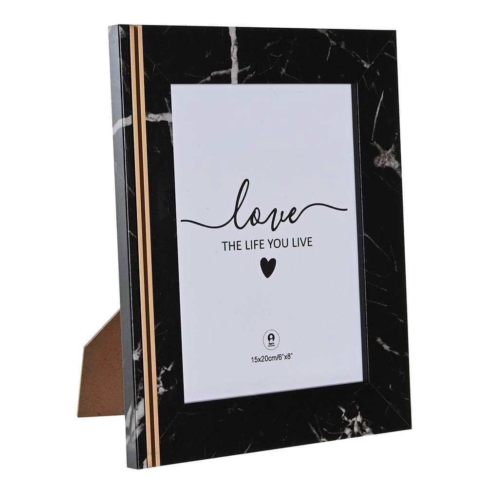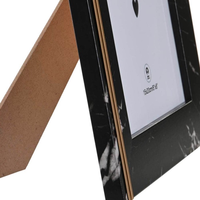 Rodéate de momentos maravillosos en familia y coloca en tu casa preciosas fotografías en este marco de fotos 15x20cm en color negro con impresión acabado mármol y franja metálica dorada con el que además darás un toque elegante a la decoración de tu casa.