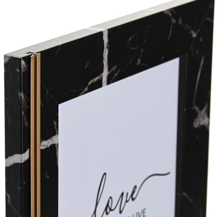 El marco para fotos esta realizado en madera Mdf con ventana de cristal para proteger la fotografía, lleva el frontal decorado con una impresión imitación mármol en color negro y una franja con doble línea en metal dorado.