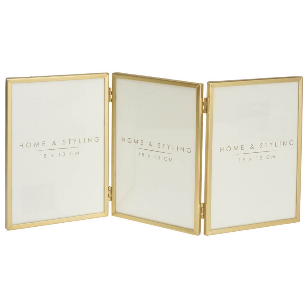 Con este marco de fotos triple en formato acordeón con un diseño sobrio y elegante en metal dorado aportarás un toque sofisticado a la decoración de tu casa, ideal para que te rodees de tus mejores recuerdos y seres queridos a la vez que embelleces y personalizas tus muebles.