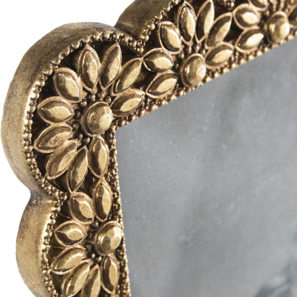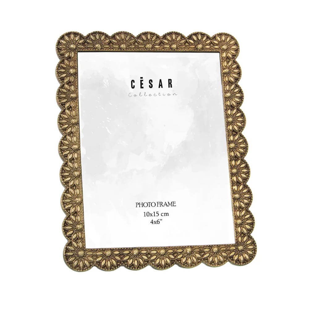 Enmarca tus momentos más preciados en este marco de fotos dorado para fotografía de 10x15cm. Diseño barroco en resina resistente. Añade elegancia a tus recuerdos con este toque sofisticado para cualquier espacio.
