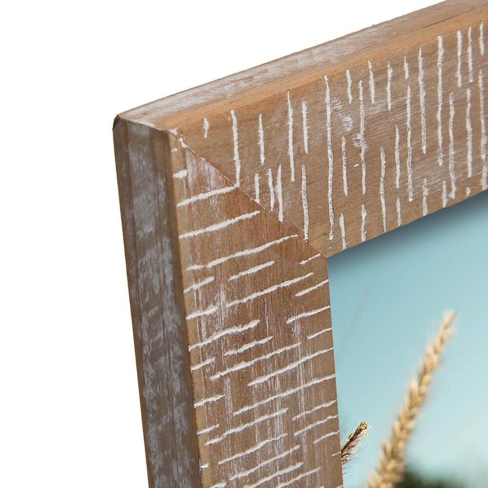 Marco de fotos 15x20cm realizado en madera de pino con acabado rústico y patina blanca. Ideal para exhibir tus mejores fotografías y dar un toque personal a tu hogar.