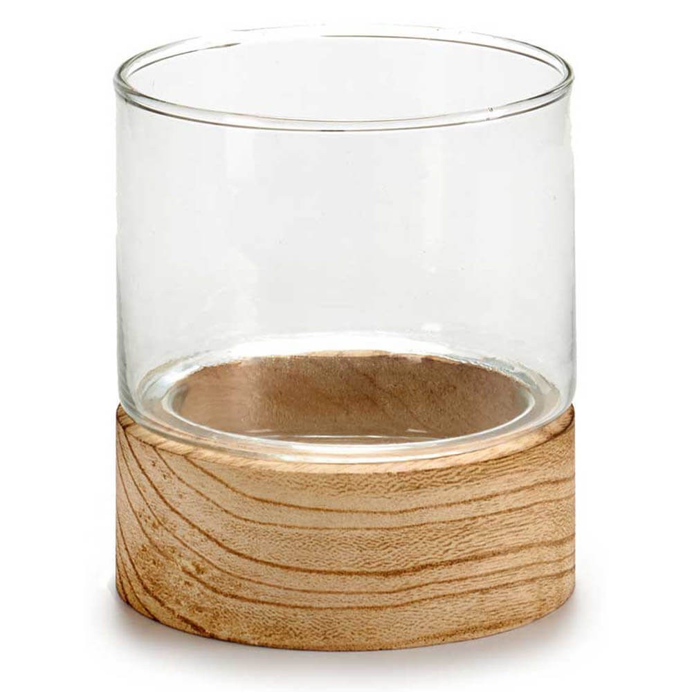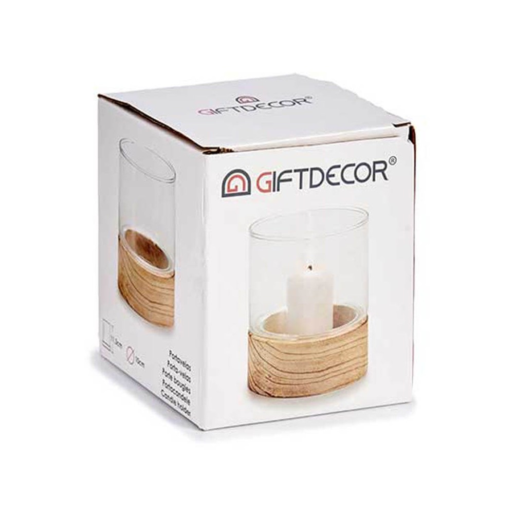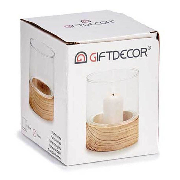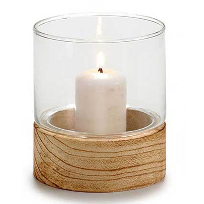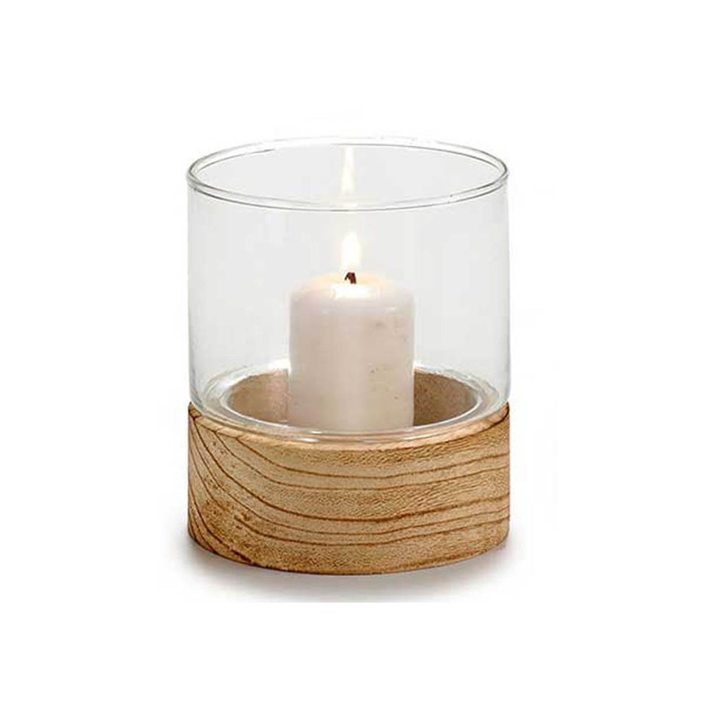 Portavelas de cristal con base de madera natural, el color puede variar ligeramente del de la foto.