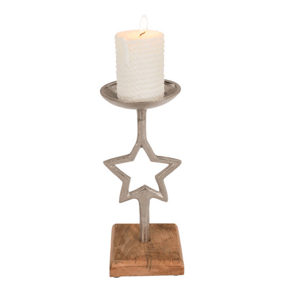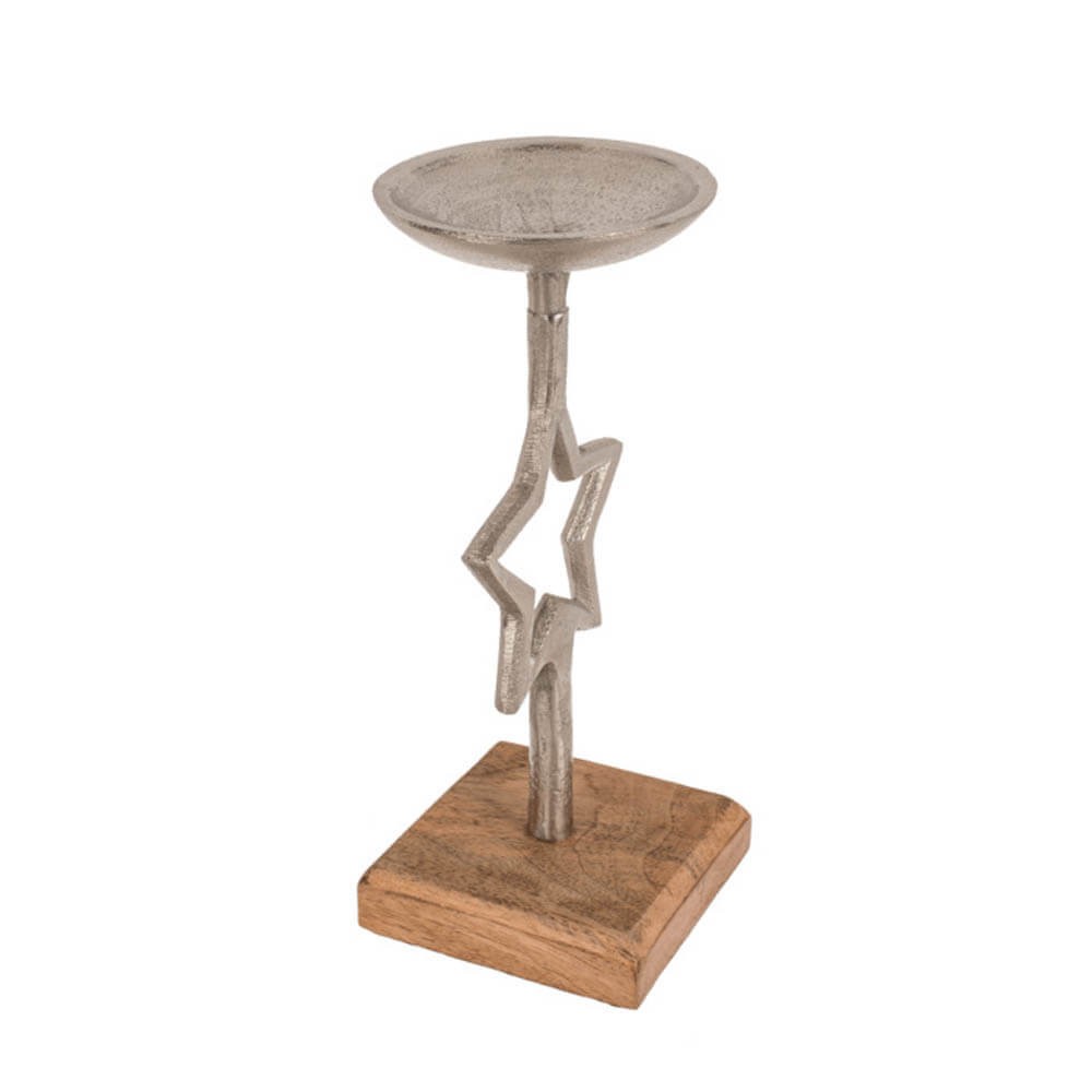 Portavelas navidad diseño estrella realizado en metal de color plata con pie de madera cuadrado.