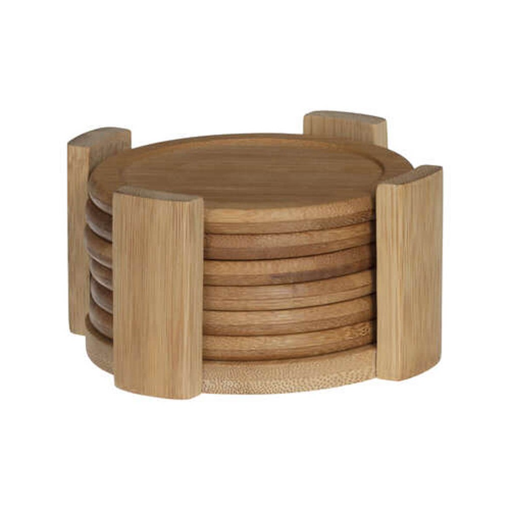 Conjunto de 6 posavasos de madera de bambú con soporte del mismo material, perfectos para proteger las mesas de manchas y arañazos.