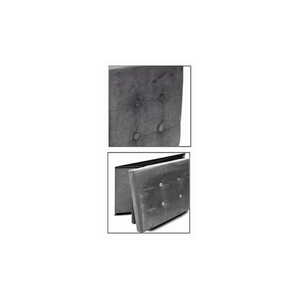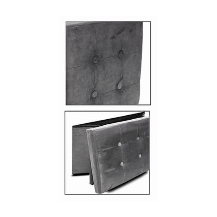 Puff con almacenaje rectangular forrado en tela de terciopelo gris.