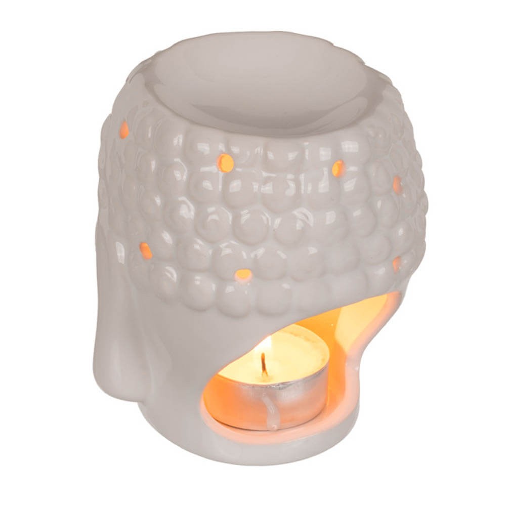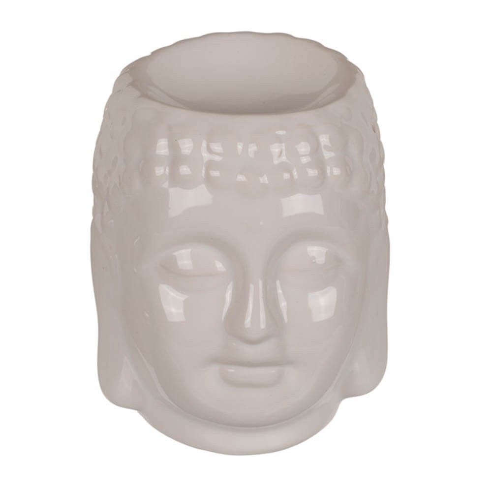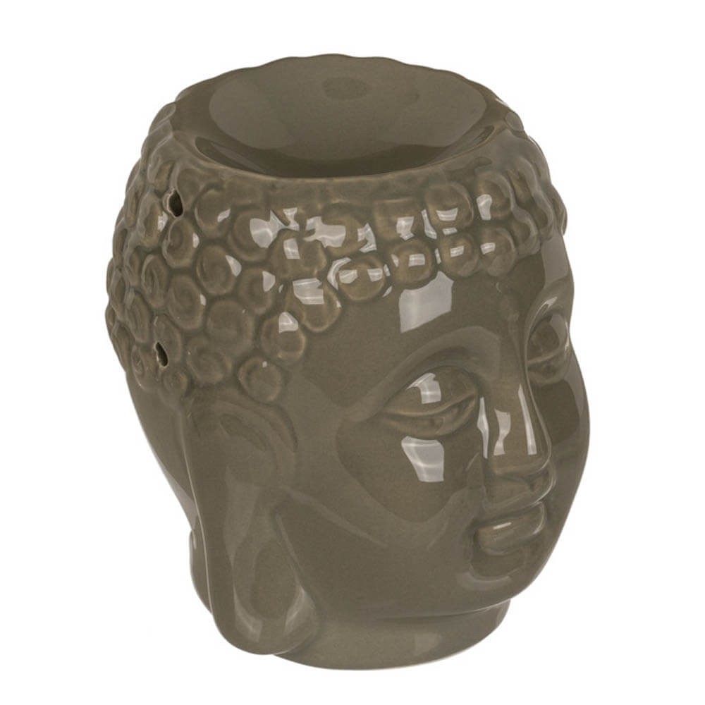 Quemador de aceites esenciales fabricado en cerámica de color gris claro, gris o blanco con un original diseño de cabeza de Buda.