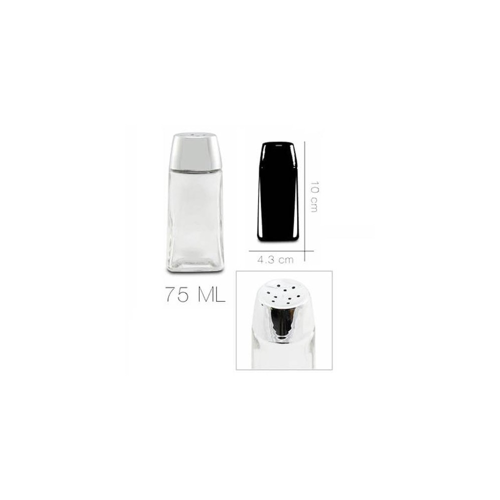 Especiero modelo Mika realizado en cristal transparente con tapa perforada de metal, perfecto para rellenarlo con sal o pimienta para salpimentar los alimentos.