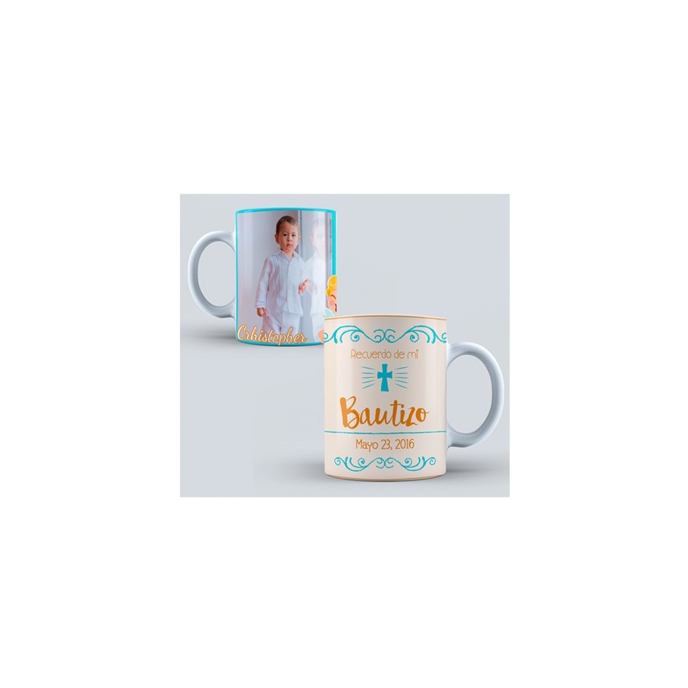Nuestra taza está decorada con un hermoso diseño de un angelito, simbolizando la protección y la bendición en esta etapa tan importante de la vida de tu hijo. Además, va decorada con la frase "Recuerdo de mi bautizo" que puedes personalizar con la fecha del bautizo de tu hijo, en la otra cara tiene un espacio para personalizarla con el nombre y la foto de tu bebé, convirtiendo esta taza en un recordatorio único y personalizado.