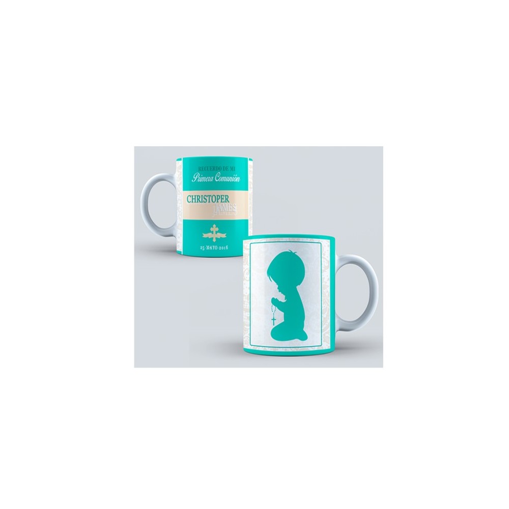 En el otro lado de la taza, encontrarás la frase "Recuerdo de mi primera comunión". Aquí, puedes personalizar la taza con el nombre de tu hijo y la fecha del evento. Esta personalización le dará un toque único y personal a la taza, convirtiéndola en un regalo exclusivo para los invitados.